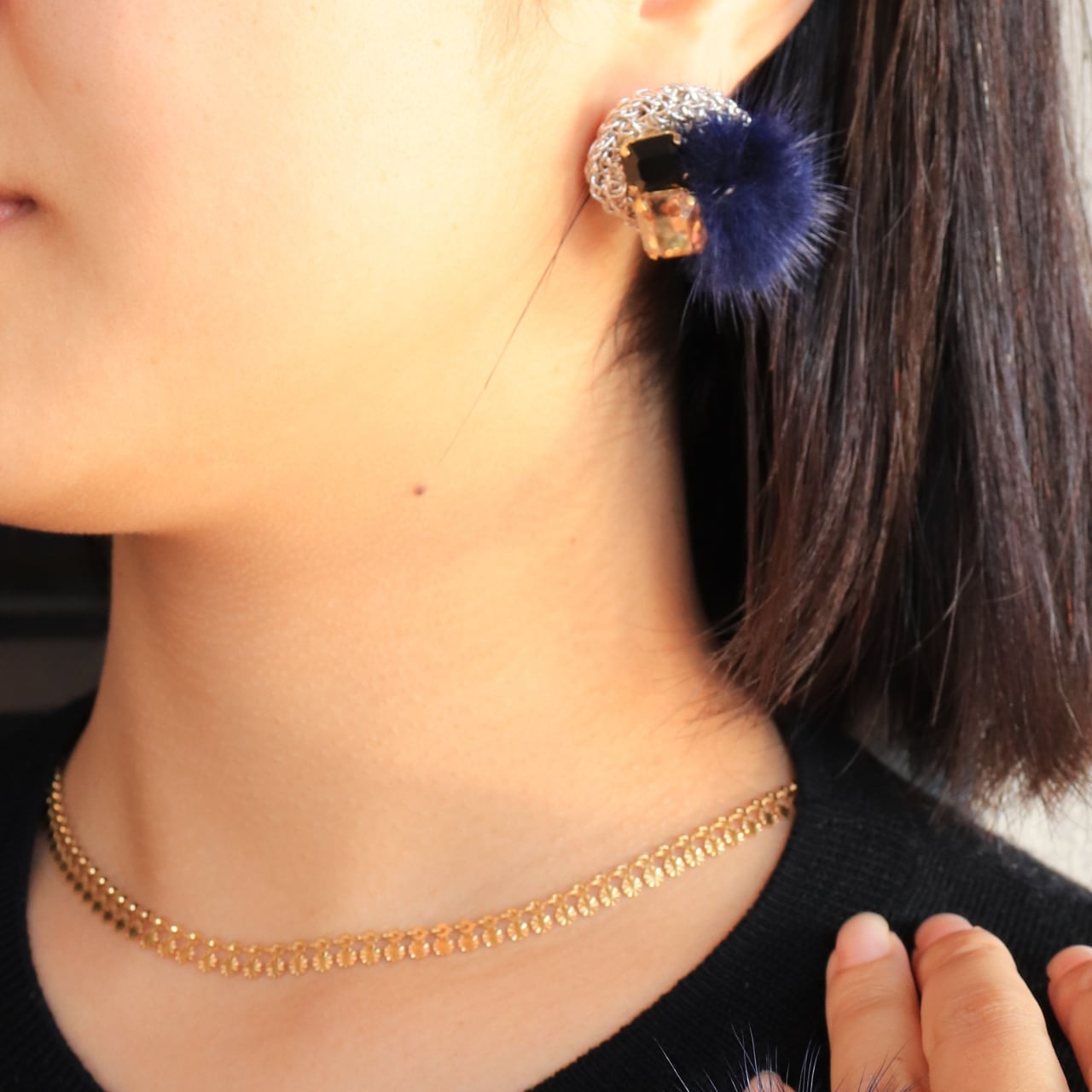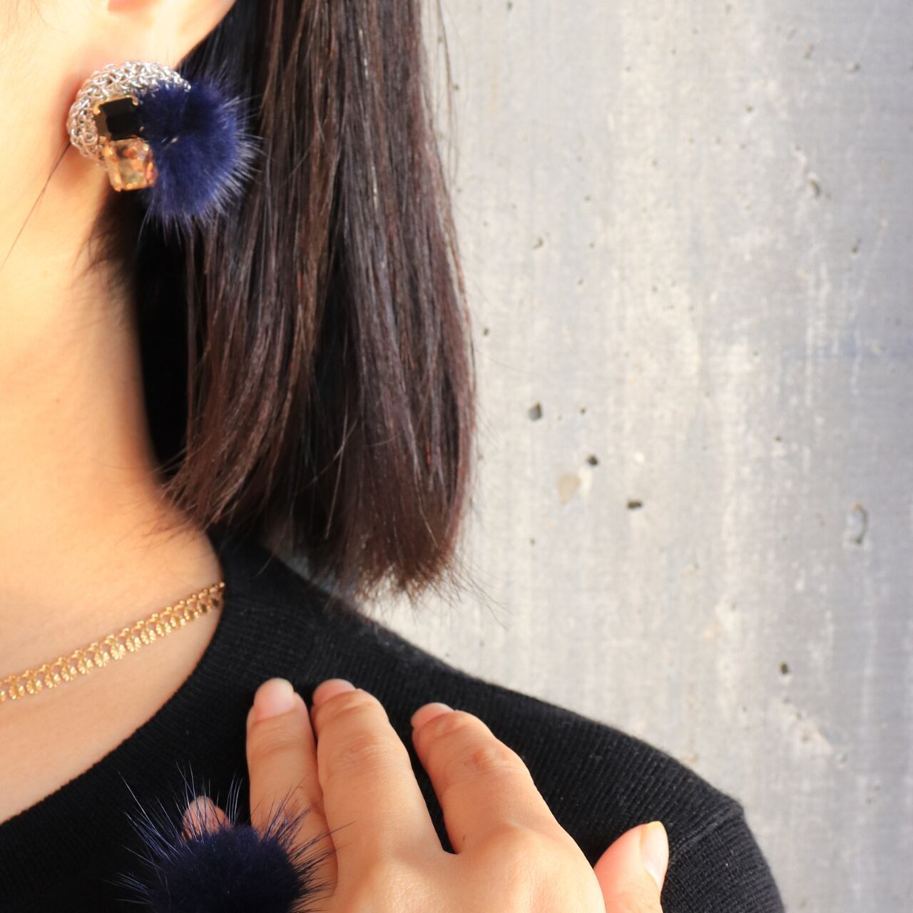 ネイビーのファーが耳元にそっと温かさをまし、ビジューが綺麗に輝きます。